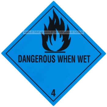 Gefahrgutaufkleber Klasse 4.3 mit Text "DANGEROUS WHEN WET" 10x10 Folie