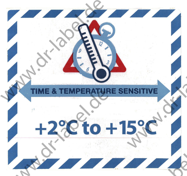 Gefahrgutetikett "TIME & TEMPERATURE SENSITIV" mit Temperatureindruck "+2°C to +15°C"