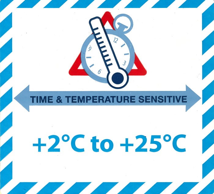 Gefahrgutetikett "TIME & TEMPERATURE SENSITIV" mit Temperatureindruck "+2°C to +25°C"