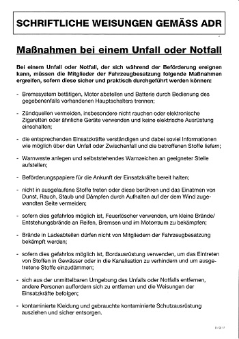 Vierseitiges Faltblatt gemäß ADR mit Hinweisen für die Mitglieder der Fahrzeugbesatzungüber die Gefahreneigenschaften von gefährlichen Gütern nach Klassen und über die bei einem Unfall zu ergreifenden Maßnahmen.